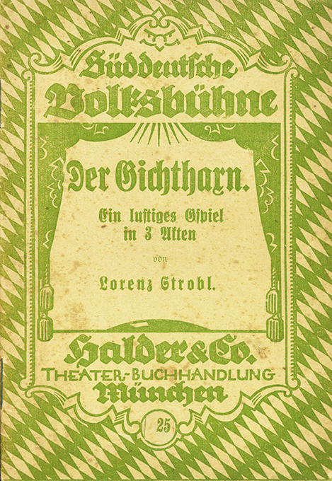 Strobl, Lorenz, Der Gichtharn. Ein lustiges Gspiel in 3 Akten. (= Süddeutsche Volksbühne Nr. 25). München, Halder (um 1925). Kl.-8°. 40 S., OBrosch. (diese stockfleckig). Sonst gut erhalten. Selten. EA. * Titelbl. mit eigenhänd. Vierzeiler als Widmung Strobls.