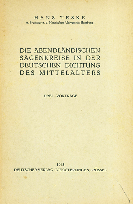 Mittelalter – Teske, Hans, Die abendländischen Sagenkreise in der deutschen Dichtung des Mittelalters. Drei Vorträge. Brüssel, ‚Die Osterlingen‘ 1943. 62 S., OBrosch. (stellenw. nachgedunkelt). Sonst gutes Exemplar. EA.