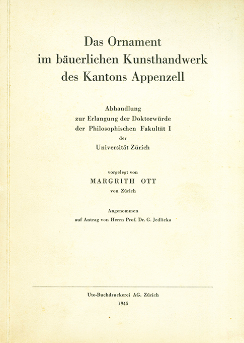 Appenzell – Ott, Margrith, Das Ornament im bäuerlichen Kunsthandwerk des Kantons Appenzell. Dissertation. Zürich 1945. 184 S. + 6 Tafeln, OKt. (dieser, Schnitt u. Titelbl. etw. stockfl. bzw. angestaubt). Teilweise Bleistiftanstr., 2 Bibl.-St. (ausgeschieden). Insges. wohlerhalten.