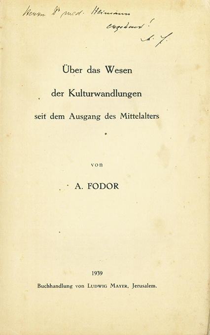 Fodor, A(ndor), Über das Wesen der Kulturwandlungen seit dem Ausgang des Mittelalters. Jerusalem, Mayer 1939. Gr.-8°. (4), 66 S., OBrosch. (diese stockfl., kleine Fehlstellen am Rand). Papier teils etw. eselsohrig, 2 Bl. leicht fleckig. Insges. wohlerhalten. EA. * Titelbl. mit eigenhänd. Widmung des Verfassers. Umschl. mit Besitzvermerk des Bewidmeten.