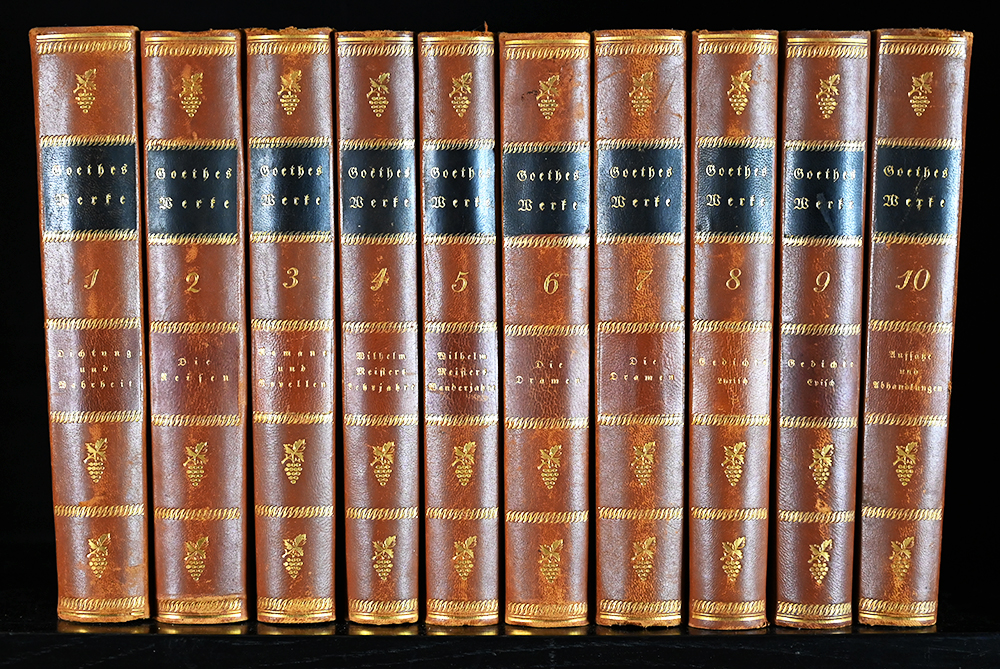 Goethe, Werke. Sanssouci-Ausgabe. 10 Bände. Potsdam, Müller & Co. (ca. 1925). Gr.-8°. Zus. 6212 S., Orig.-Halblederbände mit je 2 goldgeprägten Lederrückenschildern u. Goldprägung. Das Leder nur geringfügig berieben, gutes Exemplar der dekorativen Ausgabe. * I. Dichtung und Wahrheit. II. Die Reisen. III. Romane und Novellen. IV. Wilhelm Meisters Lehrjahre. V. Wilhelm Meisters Wanderjahre. VI. Die Dramen. VII. Die Dramen. VIII. Die Gedichte – Lyrisch. IX. Die Gedichte – Episch und Epigrammatisch; Abhandlungen und Aufsätze. X. Aufsätze und Abhandlungen.