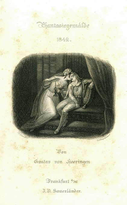 Heeringen, Gustav von, Die Brüder de Matos. Historischer Roman. (= Gest. Titelbl. u. Einband: Phantasiegemälde 1842). Frankfurt, Sauerländer 1842. Kl.-8°. Gest. Titelbl. mit Kupferstich von T.S. Engleheart, 344 S., OPappbd. mit gest. Dekoration auf beiden Deckeln u. dem Rücken (etw. berieben u. bestoßen, Rücken etw. nachgedunkelt u. mit Papierschildchen). Papier teils stockfl.; insges. recht gutes Exemplar. EA.