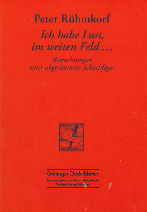 Rühmkorf, Peter, Ich habe Lust, im weiten Feld… Betrachtungen einer abtrünnigen Schachfigur. (= Göttinger Sudelblätter. Hrsg. von H.L. Arnold). Göttingen, Wallstein 1996. Gr.-8°. 57, (7) S., OKt. (Rücken verblasst, Vorderdeckel mit einigen kl. Wachsfleckchen). Sonst gutes Exemplar. EA.