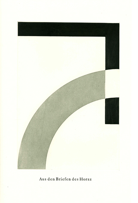 Honegger – Aus den Briefen des Horaz. Übersetzt von Bernhard Kytzler. Mit vier (einschl. Einband) Original-Radierungen von Gottfried Honegger. Neu-Isenburg 1994. Gr.-4°. 1 Bl., (24 S.), 1 Bl., OBüttenkart. mit Schutzumschlag. Tadelloses Exemplar. * 78. Druck der Edition Tiessen. Eins von 90 (ges. 145) nummer. Exemplaren der Normalausgabe, im Druckvermerk signiert. Die Texte wurden aus der Janson-Antiqua von Hand gesetzt, gedruckt auf Vélin d’Arches. Bei den Graphiken handelt es sich um Aquatinta-Radierungen in Grau u. Schwarz.