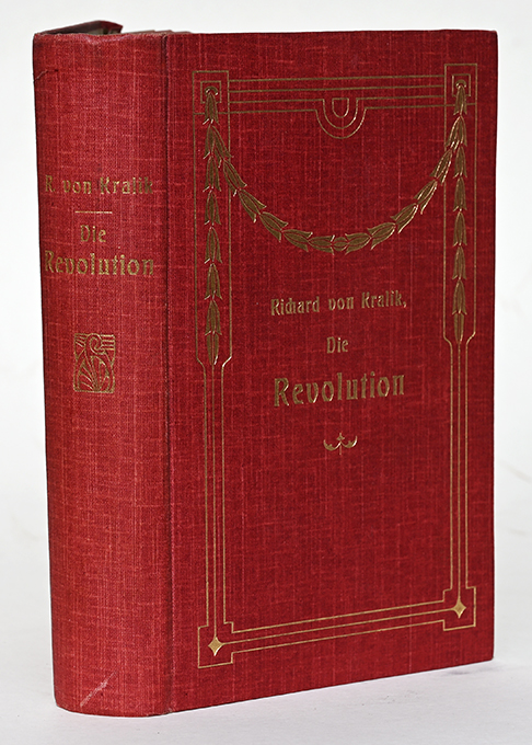 Kralik, Richard von, Die Revolution. Sieben Historien. Ravensburg, Alber 1908. 568, (2) S., OLwd. mit Goldpr. u. Ganzfarbschnitt. Nur minim. Gbrsp., insges. gutes Exemplar. EA WG² 59. * Das Königsgericht; Die Schreckensherrschaft; Der Sohn der Revolution; Drei Kaiser; Eine Kaiserhochzeit; Der Befreiungskampf; Der heilige Bund.