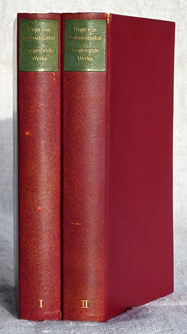 Hofmannsthal, Hugo von, Ausgewählte Werke in zwei Bänden. Hrsg. von Rudolf Hirsch. Frankfurt, S. Fischer 1957. 762, (6) u. 774, (8) S., OLdrbde. (die Rücken wie praktisch immer etw. verblasst, einige kl. Bereibungen, eine Ecke mit Läsur, eine mit kl. Fehlstelle, ein Kopfschnitt mit kl. Druckstelle). Insgesamt wohlerhalten, innen tadellos. 1. Auflage. * Vorzugsausgabe, in der Werkstatt Willy Pingel in weinrotes Kalbsleder gebunden, mit grünen, goldgepr. Lederrückenschildern. – I. Gedichte u. Dramen. II. Erzählungen u. Aufsätze.