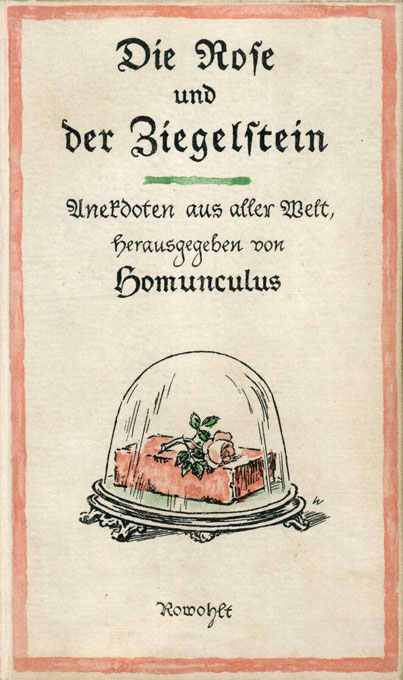 Radecki, Sigismund von, (hier unter Pseud.: Homunculus; Hg.), Die Rose und der Ziegelstein. Anekdoten aus aller Welt. Ausstattung u. Einbandgestaltung von E.R. Weiß. Berlin, Rowohlt 1938. 5.-8. Tsd. (Jahr der EA). 312, (4) S., farb. illustr. OLwd. (nur minim. angestaubt). Schönes Exemplar.