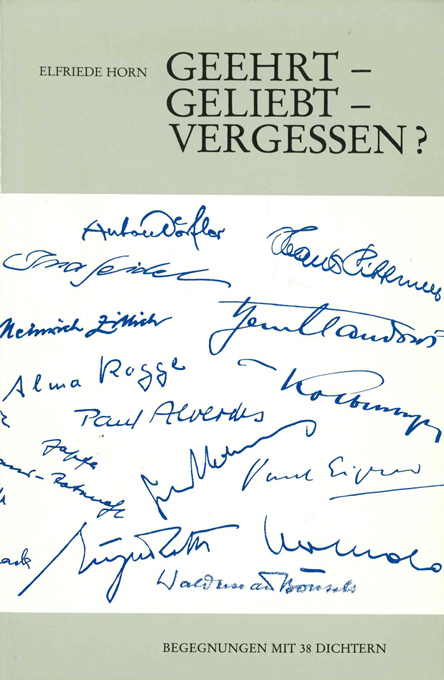 Horn, Elfriede, Geehrt – geliebt – vergessen? Begegnungen mit 38 Dichtern. Melsungen, Verlag Gutenberg 1985. Gr.-8°. 199 S. mit Abbildungen (überwiegend Dichterportraits mit faks. Unterschriften), OLwd. mit ill. OUmschl. (dieser mit einem kl. Randeinriß). Sonst gutes Exemplar. EA. * Alverdes, Bonsels, Heiseler, Kolbenheyer, Leip, Molo, E. Roth, Fr. Schnack, Ina Seidel, W. Vesper u.a.