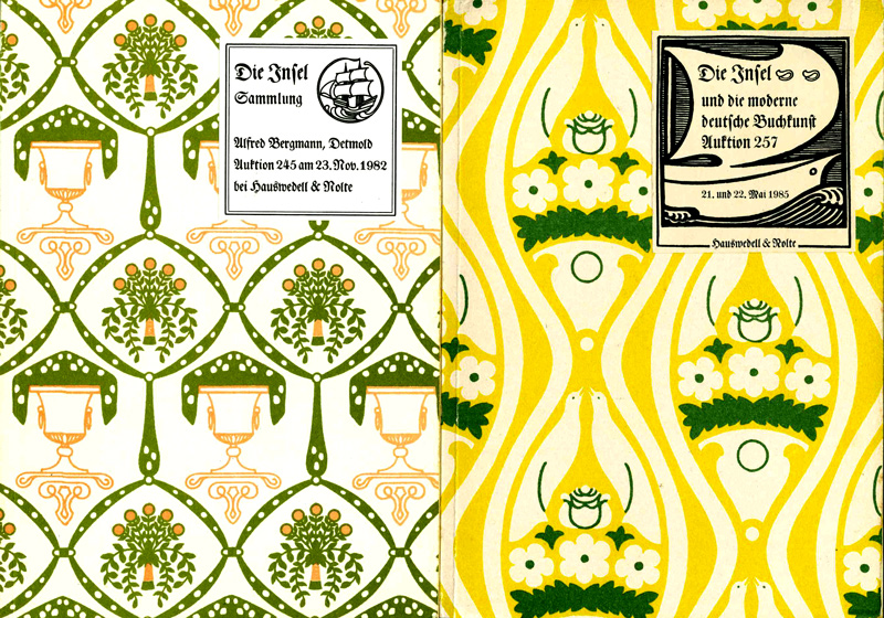 Insel – Insel-Verlag. Sammlung Alfred Bergmann, Detmold. Auktion 245. – Die Insel und die moderne deutsche Buchkunst. Auktion 257. Zwei Bände. Hamburg, Hauswedell & Nolte 1982 u. 1985. Gr.-8°. 133, (3) u. 220 S. mit zahlr. Abbildungen u. insges. 46 Tafeln, zweifarb. illustr. OKtbde. (nur minim. Gbrsp., Schnitte gering stockfl.) Insges. gut erhaltene Bände. * Diese beiden wichtigen Kataloge enthalten die Beschreibungen von insgesamt 1866 Positionen.