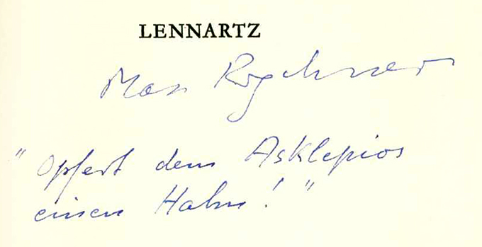 Rychner, Max, Lennartz. Erinnerungen an einen Arzt. Olten 1963. 3 Bl., 61, (3) S., 3 Bl., OHldr. (Rücken wie nahezu immer etw. verblaßt). Sonst sehr schönes Exemplar. EA WG² 53. * Exemplar aus dem Nachlaß des Verlegers. – 98. Publikation der Vereinigung Oltner Bücherfreunde. Nr. 1 von 105 (ges. 600) in der Presse numer. Exemplaren der Vorzugsausgabe [B], hier mit dem gedruckten Vermerk „Eigentum von William Matheson“. Vortitelblatt nicht nur wie bei den Vorzugsausgaben üblich von Rychner signiert, sondern mit eigenhänd. Zusatz des Dichters: „Opfert dem Asklepios einen Hahn!“. Die Vorzugsausgaben wurden von Hugo Peller in blaues Maroquin-Halbleder gebunden, mit golgepr. Rückentitel, Kopfgoldschnitt, handgestochenen Kapitalen u. Batik-Modeldruck-Überzugspapier. – Satz des Textes aus der Garamond-Antiqua, gedruckt auf kräftiges Zerkall-Bütten.