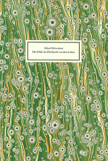 Rohse – Schweitzer, Albert, Die Ethik der Ehrfurcht vor dem Leben. Mit einem Orig.-Kupferstich von Otto Rohse. Neu-Isenburg 1978. 20 x 30 cm. 30, (2) S., handmarmor. OPp. (W. Pingel; Überzugspapier von M. Duval). Gelenke kaum sichtbar berieben, nahezu tadelloses Exemplar mit Schutzumschlag. Tiessen 22. Spindler 41.8. * 8. Druck der Edition Tiessen. Eins von 125 (ges. 200) numer. Exemplaren der Normalausgabe. Der Kupferstich wurde von Rohse signiert. Der Text wurde aus der Janson-Antiqua von Hand gesetzt, gedruckt auf Vélin d’Arches-Bütten.