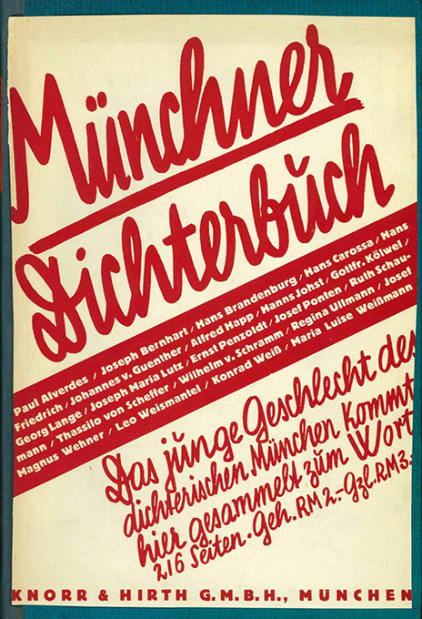 Münchner Dichterbuch. München, Knorr & Hirth 1929. Gr.-8°. 214, (10) S., OHlwd. (neu aufgebunden mit neuen Vorsätzen u. goldgepr. Lederrückenschild). Beiliegt die Vorderseite des OUmschlags. Gutes Exemplar. EA. * Enthält jeweils einige Gedichte bzw. kurze Prosastücke von Alverdes, Carossa, Kölwel, J.M. Lutz, Penzoldt, Ponten, Schaumann, Regina Ullmann, K. Weiß, M.L. Weißmann u.a., dazu biograph. Essays über die Dichter von Penzoldt, K. Weiß u.a.