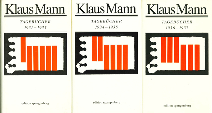 Mann, Klaus, Tagebücher 1931 – 1937. Hrsg. mit Nachworten u. Anmerkungen von J. Heimannsberg, P. Laemmle u. W.F. Schoeller. Drei Bände. München, Edition Spangenberg 1989 – 1990. Zus. 772 S., OLwdbde. mit OUmschlägen. Sehr gut erhalten, in den besseren Einbänden (statt Pappe). Ohne die später erschienenen Bände 1938 – 1943. EA.