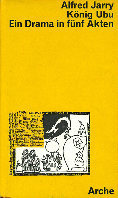 Jarry, Alfred, König Ubu. Ein Drama in fünf Akten. Übertr. u. dokumentarische Anhang von Marlis u. Paul Pörtner. (= Die kleinen Bücher der Arche 459/460). Zürich, Arche 1967. 71 S. mit Illustrationen, illustr. OPp. (Kapitale minim. angestoßen). Sonst gutes Exemplar. 1. Auflage in dieser Reihe.