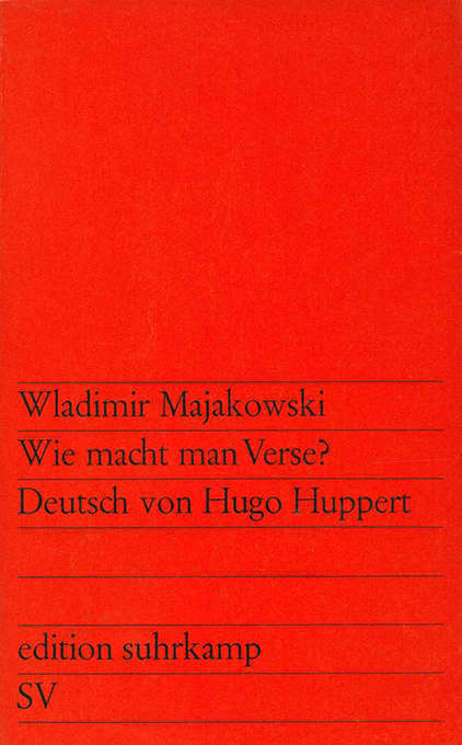 Majakowski, Wladimir, Wie macht man Verse? Übertr. u. mit Nachwort von Hugo Huppert. (= edition suhrkamp 62). Frankfurt, Suhrkamp 1964. Kl.-8°. 196, (12) S., OKt. mit OUmschl. Papier wie üblich materialbedingt etw. vergilbt, sonst gutes Exemplar. 1. Auflage dieser Neuübersetzung.