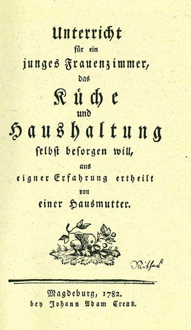 Hauswirtschaft – Unterricht für ein junges Frauenzimmer, das Küche und Haushaltung selbst besorgen will, aus eigener Erfahrung ertheilt von einer Hausmutter. Faksimile-Nachdruck der Ausgabe Magdeburg, 1782. München, Krauss 1975. Kl.-8°. (14), 260, (14) S., OPp. mit mont. Rückenschild. Tadellos. * Enthält auch zahlreiche Kochrezepte. Sehr schöner, in kleiner Auflage gedruckter Reprint auf Bütten.