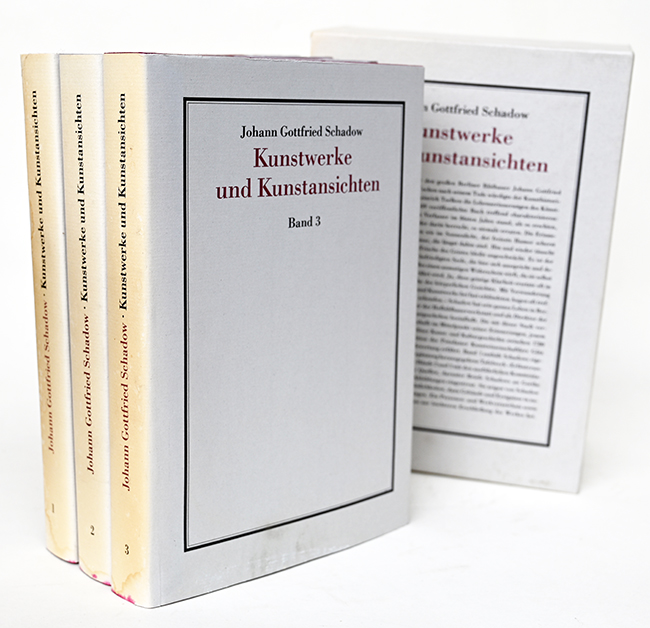 Schadow, Johann Gottfried, Kunstwerke und Kunstansichten. Ein Quellenwerk zur Berliner Kunst- und Kulturgeschichte zwischen 1780 und 1845. Kommentierte Neuausgabe der Veröffentlichung von 1849, hrsg. von Götz Eckardt. Drei Bände. Berlin, Deutscher Verlag für Kunstwissenschaft 1987. Gr.-8°. Zus. 956 S. mit 417 Abbildungen, OLwdbde. mit OUmschlägen (diese an den Rücken nachgedunkelt). Die Fußkapitale der Bände jeweils mit einem Wasserrand, sonst gut erhalten. 1. Auflage in Westdeutschland.