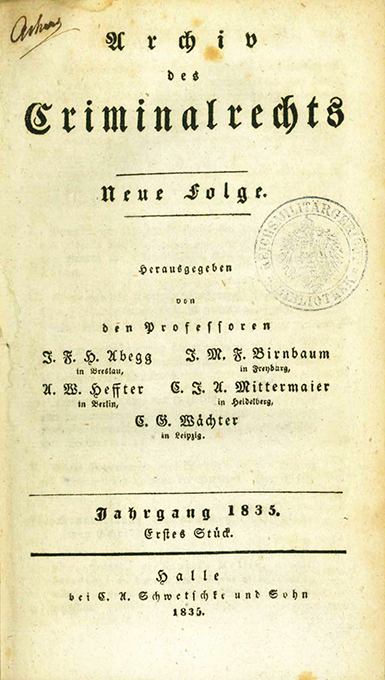 Jura – Archiv des Criminalrechts. Hrsg. von J.F.H. Abegg, J.M.F. Birnbau, A.W. Heffter u.a. Neue Folge / Jahrgang 1935. Erstes – Viertes Stück in einem Band (vollständiger Jahrgang). Halle, Schwetschke 1835. (4), 612 S., Pappbd. der Zeit (Rücken stark beschädigt u. mit altem Bibliotheksschildchen). Titelbl. mit altem Bibliotheksstempel u. Namenszug von alter Hand, Papieroberkanten teils etw. wasserrandig. Insges. innen gut erhalten.