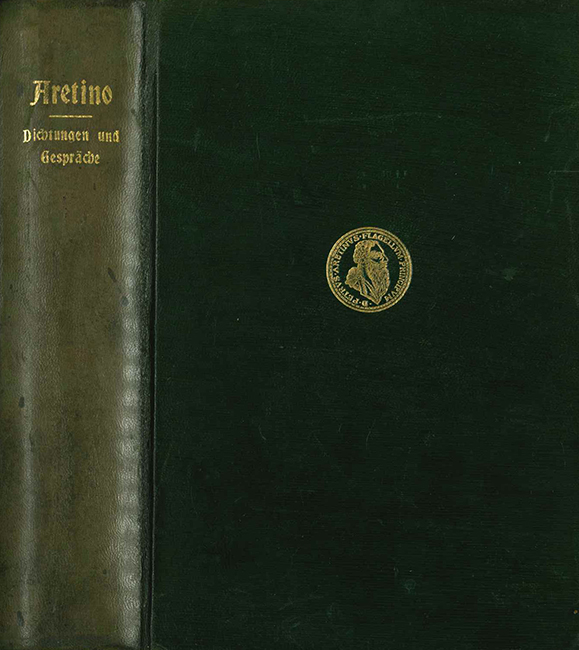 Erotica – Aretino, Pietro – Dichtungen und Gespräche des Göttlichen Aretino. Deutsche Bearbeitung u. Einführung (28 S.) von Heinrich Conrad. O.O., Privatdruck des Herausgebers 1904. (4), 352 S., dunkelgrüner, geglätteter OGanzlederbd. mit goldgepr. Rückentitel u. Deckelvignette (Medaillon mit Bildnis Aretinos im Profil; der Rücken wie meist stark verblasst u. mit kl. Fleckchen, minim. Kratzspuren). Nur das erste u. letzte Bl. zart stockfl., Papier in den Falzen wie meist mit Oxidationsspuren durch die Klammerheftung. Insges. wohlerhaltenes, unbeschnittenes Exemplar. 1. Auflage dieser Übersetzung. Hayn-Gotendorf I.111. * In kleiner Auflage nur für Subskribenten auf Bütten gedruckt, nebst der „ausdrücklichen Verpflichtung“ der Herausgebers, „niemals einen Neudruck zu veranstalten oder veranstalten zu lassen.“ – Enthält: Die Wollüstigen Sonette; Die Fahrende Hure; Maddalena und Giulia; Der Zoppino.