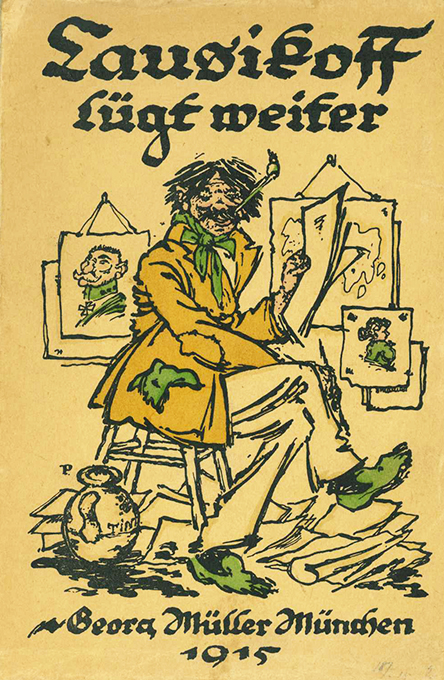 Ettlinger, Karl (″Karlchen“), Lausikoff lügt weiter. Der Herren Grandbouche, Lausikoff, Plumpudding, Srb neueste Kriegsberichte. München, Georg Müller 1915. 119, (9) S., OBrosch. mit der farb. Zeichnung von Emil Preetorius (Rücken lädiert u. mit 3 cm langer Fehlstelle). Umschlagrückseite u. Papier nur vereinzelt etw. stockfl., Namenszug von alter Hand. Insges. noch wohlerhaltenes, unbeschnittenes Exemplar. EA.