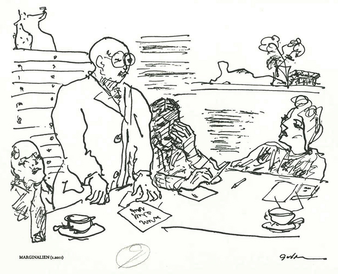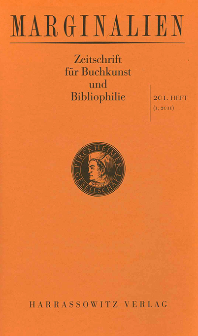 Marginalien, Heft 1 / 2011 (Nr. 201, Vorzugsausgabe). Zeitschrift für Buchkunst und Bibliophilie. Hrsg. von der Pirckheimer-Gesellschaft. Wiesbaden, Harrassowitz 2011. Gr.-8°. 107 S. mit Abbildungen + 8 S. typograph. Beilage (Buchdruck), OBrosch. mit OUmschl. Tadellos. * Mit einem beilieg. Original-Nyloprint „Bruno Kaiser während einer Sitzung der Jury ‚Schönste Bücher‘“, auf geripptes Bütten gedruckt u. vom Künstler signiert. – Aus dem Inhalt: Rainer Ehrts Künstlerbücher; Gabriel von Max; Mechthild Lobisch; Kinderbuchsammlung Oskar Roesger; Franz Pfemfert u. Die Aktion.