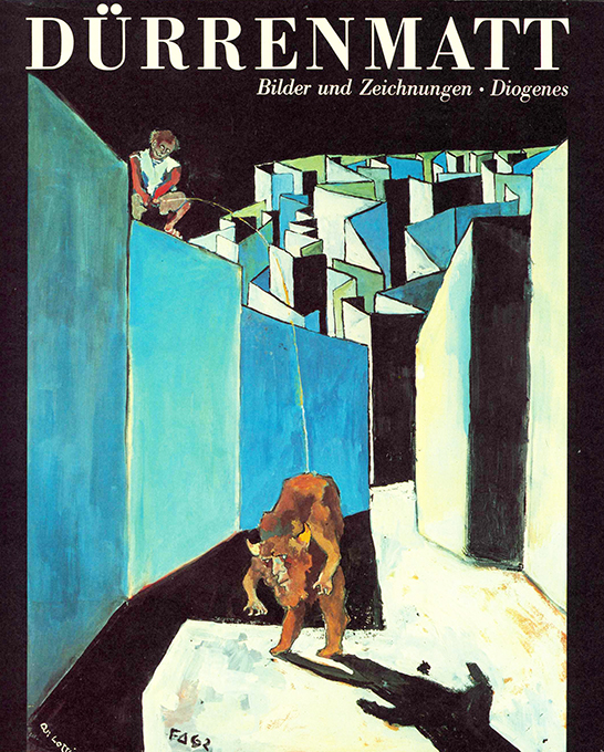 Dürrenmatt. Bilder und Zeichnungen. Hrsg. von Christian Strich. Mit einer Einleitung von Manuel Gasser und Kommentaren von Friedrich Dürrenmatt. (= 59. Werk im ‚Club der Bibliomanen‘). Zürich, Diogenes 1978. 27,5 x 33,5 cm. (198 S.) mit 102 (teils farb.) Tafeln, OLwd. mit farb. illustr. OUmschl. Hint. Vorsatz mit Verlagsstempel „B“, sonst sehr gutes Exemplar im (nur minim. unfrischen) Schuber. EA WG² 52.