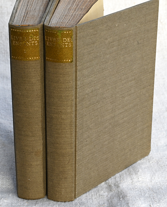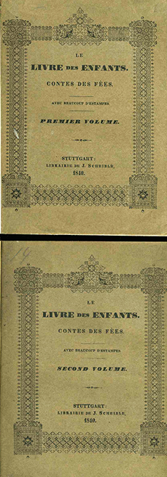 (Perrault, Charles), Contes des Fées. Avec beaucoup d’estampes. (Sprache: Französisch). (= Le livre des enfants). Zwei Bände. Stuttgart, Scheible 1839 – 1840. Kl.-8°. 2 gest. Titelbl., 419 u. 383 S., 40 Lithotafeln, spätere Pappbde. mit goldgepr. Lederrsch. u. eingebundenen OBroschuren. Papier durchgehend etw. braun- bzw. feuchtigkeitsfleckig. Insges. jedoch gutes Exemplar. Sehr selten. 1. Auflage. Nicht bei Sander. * Frühe illustrierte Ausgabe, enthaltend 40 ganzseit. Federlithographien eines nicht genanntes Künstlers. Einige Bl. mit Signatur „Lith. Anst. v. Pobuda“. Für „weniger Bemittelte“ wurde auch eine nicht illustrierte Ausgabe herausgegeben.