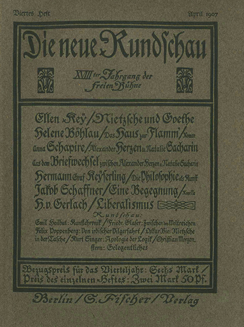 Nietzsche – Key, Ellen, Nietzsche und Goethe. S. 385 – 404 in: Die neue Rundschau 3/1907. Gr.-8°. (132 S.) mit zahlr. Zierstücken von E.R. Weiß, OBrosch. (stark schiefgelesen, kl. Läsuren). Insges. noch wohlerhalten. * Weit. Beitr. von Helene Böhlau, Morgenstern, Schaffner u.a.