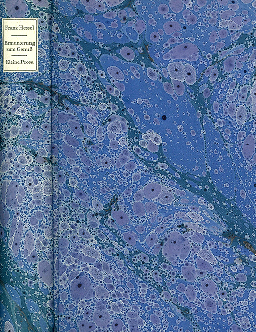 Hessel, Franz, Ermunterungen zum Genuß. Kleine Prosa. Hrsg. von Karin Grund u. Bernd Witte. Berlin, Brinkmann & Bose 1988. 2. Aufl. 3 Bl.,275, (5) S., 4 Bl., Pappbd. mit handmarmor. Überzugspapier u. Rückenschild aus dem Orig.-Einband, transparenter Schutzumschlag. Tadelloses Exemplar im hübschen, individuellen Handeinband.