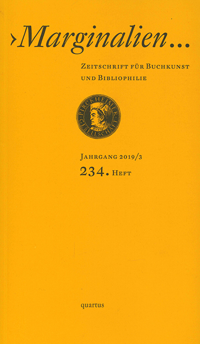 Marginalien, Heft 3 / 2019 (Nr. 234, Vorzugsausgabe). Zeitschrift für Buchkunst und Bibliophilie. Hrsg. von der Pirckheimer-Gesellschaft. Bucha, quartus 2019. Gr.-8°. 127 S. mit Abbildungen + 8 S. typograph. Beilage (Buchdruck auf Maschinenbütten), OKlappenkart. Tadellos. * Mit einem beilieg. Orig.-Holzschnitt von Frank Eißner „Schöne mit Kappe“ (eins von 200 Ex.), vom Künstler selbst gedruckt u. signiert. – Aus dem Inhalt: Celestino Piatti u. die Sonderreihe DTV; Heinrich Vogeler – die Eigner seiner frühen Exlibris; Frank Eißner u. seine Handpresse. – Beilage: Julius Zeitler, Der Buchkünstler u. der Verlagspropagandist. Mit zahlr. Abbildungen.