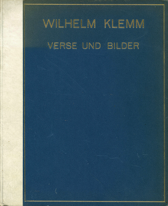 Klemm, Wilhelm, Verse und Bilder. Mit 14 ganzseit. Reproduktionen von Autotypien u. Holzschnitten. Berlin, Verlag der Wochenschrift „Die Aktion“ 1916. 26,5 x 32,5 cm. 63 S., OHalbpergamentbd. mit goldgepr. Deckel- u. Rückentitel u. Kopfgoldschnitt (feinste Kratzspuren, das sehr lichtempfindliche blaue Überzugspapier stellenw. etw. verblasst). Insges. gutes bis sehr gutes Exemplar. EA WG² 2. Raabe 159.3. * In kleiner Auflage auf Bütten gedruckt. Die Graphiken zeigen, gerade durch ihre verschiedenen Techniken, welche man als Miniserien innerhalb des Buches bezeichnen könnte, ein vielfältiges Spektrum des damals noch recht jungen Dichters und Graphikers. Erschienen im Verlag Franz Pfemferts, für dessen „Die Aktion“ Klemm expressionistische Dichtungen schrieb.