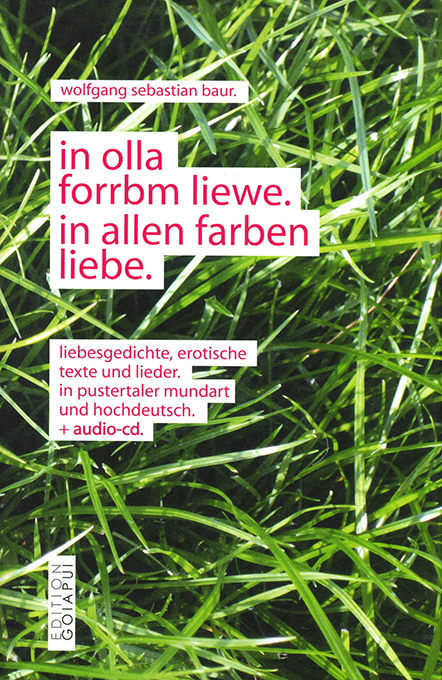 Mundart, Pustertaler – Baur, Wolfgang Sebastian, in olla forrbm liewe / in allen farben liebe. Liebesgedichte, erotische Texte und Lieder. In Pustertaler Mundart und hochdeutsch. Mit einer vom Autor besprochenen Audio-CD. Berlin, Edition Goiapui 2009. 171, (5) S. mit ganzseit. SW-Fotografien, OPp. mit farb. ill. OUmschl. Tadelloses Exemplar. EA.