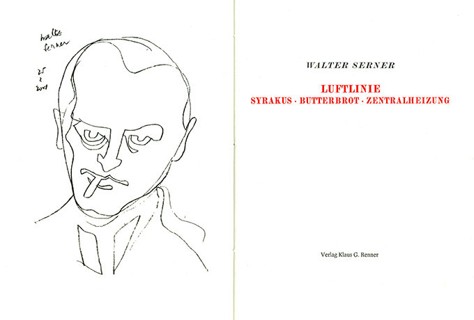 Serner, Walter, Luftlinie. Syrakus – Butterbrot – Zentralheizung. Nachwort von Klaus G. Renner. Mit einer Portraitzeichnung Serners von Stanley Chapman als Frontispiz. Zürich u. Ottiglio, Renner 2010. 18 x 25 cm. (16 S.), OBütten-Klappenbroschur. Tadellos. 1. Auflage. * Eins von nur 60 + V handschr. nummer. Exemplaren. Aus der Leipziger Antiqua gesetzt u. vom Bleisatz auf Bütten von Cartiere Amatruda, Amalfi, gedruckt.