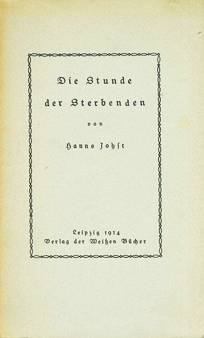 Johst, Hanns, Die Stunde der Sterbenden. [Drama]. Leipzig, Verlag der Weißen Bücher 1914. 39 S., OBüttenbrosch. (stellenw. etw. nachgedunkelt). Sonst sehr gutes, unbeschnittenes Exemplar. Selten. EA des Erstlings. WG² 1. Raabe 141.3.