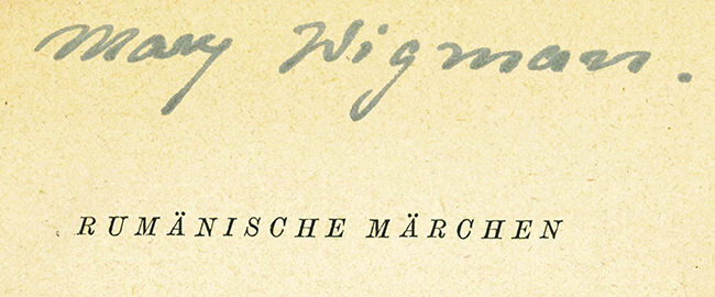Rumänien – Rumänische Märchen. In deutscher Übersetzung nach Haupttypen ausgewählt u. mit Anmerkungen versehen v. Alexander Dima. Leipzig, Harrassowitz 1944. 264 S., späterer Pappbd. mit marmor. Überzugspapier u. goldgepr. Lederrückenschild (Rücken etw. verblasst). Vortitelbl. ausgebessert, das Kriegspapier wie immer materialbed. nachgedunkelt. Insges. sehr gutes Exemplar im individuellen Handeinband (statt broschiert). DEA. * Aus dem Nachlaß der berühmten Tänzerin Mary Wigman mit ihrem eigenhänd. Namenszug auf dem Vortitelblatt.