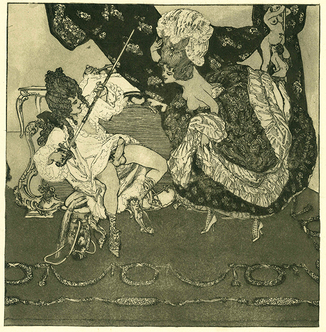 Bayros, Franz von, Die Fliege. Orig.-Aquatintaradierung. (Wien, Stern-Rosner 1907). Bildgröße 20 x 20,5 cm, Blattgr. 30 x 34,5 cm. Auf Bütten. Sehr gut erhalten. Vgl. Hayn-Gotendorf IX.43. Brettschneider 33. * Eins von 530 Exemplaren. – 2. Lieferung / Blatt 9 aus: Die Bonbonniere. Galante und artige Sammlung erotischer Phantasien. Von Choisy le Conin (d.i. Franz Bayros).