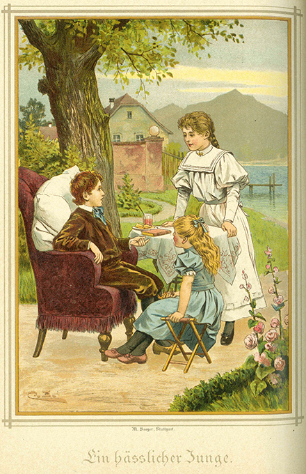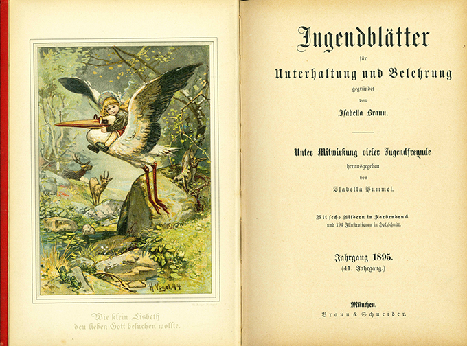 Jugendblätter. Begründet von Isabella Braun. Unter Mitwirkung vieler Jugendfreunde hrsg. von Isabella Hummel. Sammlung 3 Bänden: 38. Band (1892), 41. Band (1895) u. 44. Band (1898). München, Braun & Schneider 1892 – 1898. Zus. 1848 S. mit sehr zahlr. Illustrationen in Holzschnitt + 21 SW-Tafeln + 18 Farbtafeln in Chromolithographie, blindgeprägte OLeinenbde. mit Goldpr. (Ecken u. Kapitale leicht bestoßen, die Fußkapitale mit Läsuren). Eine geringe Anzahl von Seiten mit Läsuren, ein Blatt mit Eckabriss. Ein Schnitt u. ein Titelblatt mit Tintenflecken. Insges. wohlerhalten. * Enthält Gedichte, Erzählungen, Biographisches, Belehrendes, Beschäftigungen u. Spiele, Rätsel, Charaden u.a. – Den Bänden 1895 u. 1898 beigebunden: Der kleine Tierfreund. III. u. VI. Jahrgang (1892 ist der Tierfreund noch nicht erschienen).