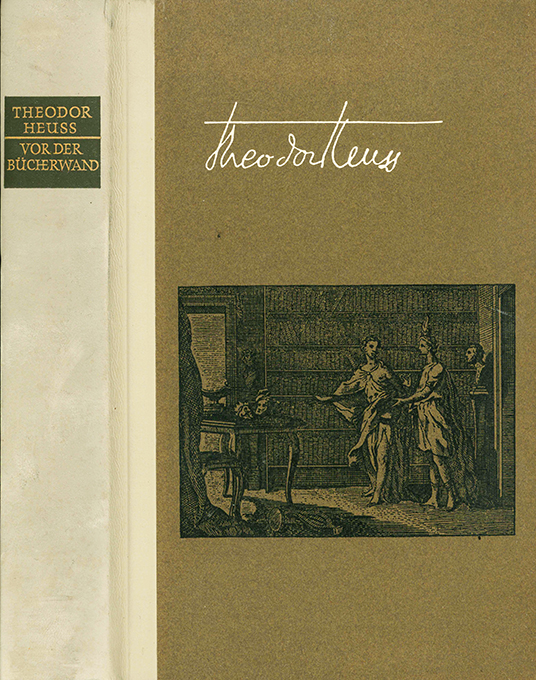 Heuss, Theodor, Vor der Bücherwand. Skizzen zu Dichtern und Dichtung. Hrsg. von Friedrich Kaufmann u. Hermann Leins. Berlin u.a., Deutsche Buch-Gemeinschaft 1965 (Lizenz von Wunderlich). 306, (2) S. mit 33 Abbildungen im Text u. auf Tafeln, illustr. OHalblederbd. mit goldgepr. Rückentitel (Rücken nur minim. nachgedunkelt). Sonst sehr gut. * Abbildungen bzw. Beiträge über Andreas-Salomé, George, Hesse, H. und Th. Mann, Ringelnatz, Zuckmayer u.a.