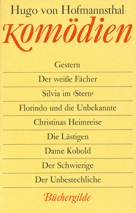 Hofmannsthal, Hugo von, Komödien. Frankfurt u.a., Büchergilde Gutenberg 1974 (Lizenz von S. Fischer). 514, (2) S., OLwd. mit OUmschl. (dieser am Rücken minim. verblasst). Insges. sehr gutes Exemplar. Beiliegt ein Verlagsprospekt zu Hofmannsthal. * Inhalt: Gestern; Der weiße Fächer; Silvia im ‚Stern‘; Florindo und die Unbekannte; Christinas Heimreise; Die Lästigen; Dame Kobold; Der Schwierige; Der Unbestechliche.