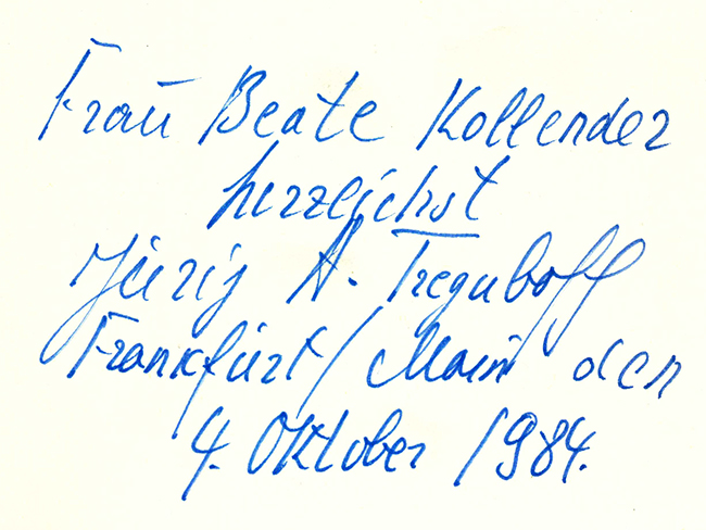 Treguboff, Jurij A., Die wundersamen Erlebnisse des Aristarch Trofimowitsch Jermolow. Roman. Frankfurt, Feuervogel 1984. 356, (4) S., OLwd. mit OUmschl. (einige kl. Randeinrisse verso geklebt). Sonst tadellos. EA. * Vortitelblatt mit fünfzeil. eigenhänd. Widmung des Autors in deutscher Sprache.