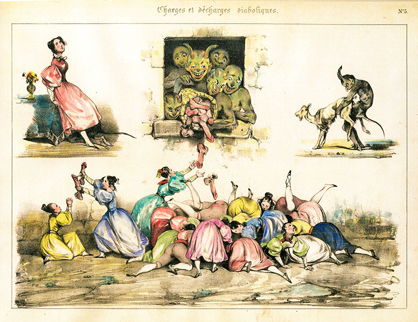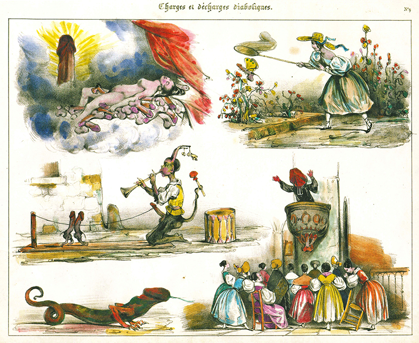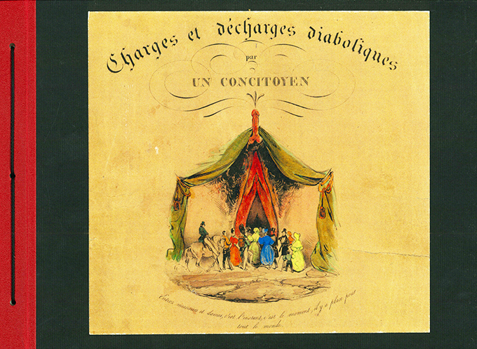 Erotica – Lepoittevin, Eugène Modeste Edmond, Charges et dècharges diaboliques par un concitoyen. à Bruxelles chez tous les Marchands. Faksimile-Nachdruck eines der sehr seltenen kolorierten Exemplars aus dem Jahr 1830. (Leipzig), Erotica Raritäten-Presse für Frölich & Kaufmann (2020). 32 x 23 cm (quer). Titelblatt, 12 farbige Tafeln auf kräftigem Karton, 1 Bl. editorische Notiz, farb. illustr. OHlwd. (Kordelbindung). Tadelloses Exemplar. In kleiner Auflage gedruckt. * Lepoittevin (1806 – 1870) war ein französischer Maler, Karikaturist und Schöpfer berühmter grotesk-erotischer und ausgesprochen phantasievoller Diablerien. Hier handelt es sich um Lepoittevins berühmteste erotische Folge, „sie gehört zu dem Besten, was im Biedermeier an eindeutiger Erotik entstand…“ (Nachwort)