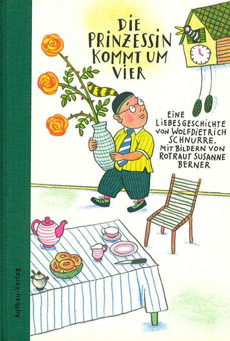 Berner – Schnurre, Wolfdietrich, Die Prinzessin kommt um Vier. Eine Liebesgeschichte. Mit Bildern von Rotraut Susanne Berner. Berlin, Aufbau-Verlag 2000. 17 x 25 cm. (32 S.) mit 17 (davon 15 doppelblattgr.) farbigen Illustrationen, farb. illustr. OHlwd. Tadelloses Exemplar. 1. Auflage. * Bei den Bildern handelt es sich um Original-Flachdruckgraphiken, von der Künstlerin direkt auf Film gezeichnet.