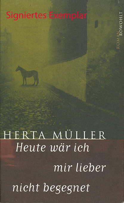 Müller, Herta, Heute wär ich mir lieber nicht begegnet. Roman. Reinbek, Rowohlt 1997. 239 S., OLwd. mit sehr zart blindgepr. Illustration bzw. Vignette auf Vorder- u. Rückdeckel sowie farb. illustr. OUmschl. Gutes Exemplar. EA. * Titelblatt mit dreizeil. eigenhänd. Widmung der Literatur-Nobelpreisträgerin.