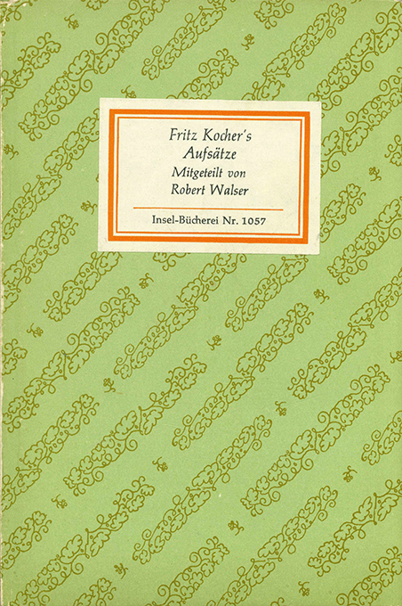 Insel-Bücherei 1057 – Walser, Robert, Fritz Kocher’s Aufsätze. Mitgeteilt von Robert Walser. Nachwort von Ilona Siegel. Mit 11 Zeichnungen, Doppeltitel u. Kapitelüberschriften von Karl Walser. (= Insel-Bücherei 1057). Leipzig, Insel 1983. Kl.-8°. 106, (2) S., gemusterter OPp. (Überzugspapier Jenne 685). Rücken etw. berieben, sonst gut erhalten. 1. Auflage. Kästner 1057.