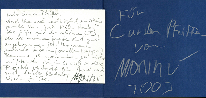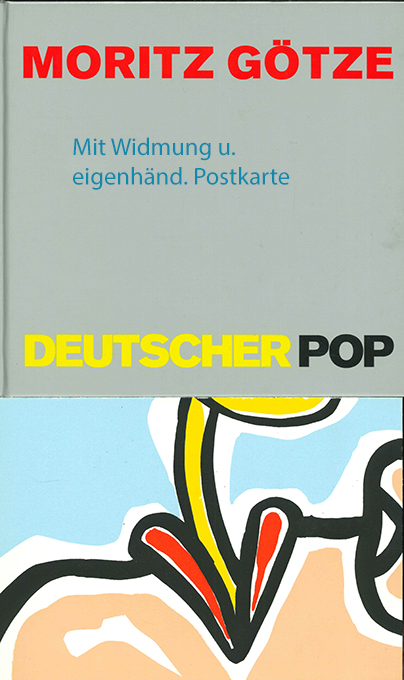 Götze – Deutscher Pop. Moritz Götze. Ausstellung in Osnabrück, Berlin u. Frankfurt / Main. Dresden, Verlag der Kunst 2002. 15,5 x 14,5 cm. 93, (3) S. mit sehr zahlr. farb. Abbildungen, OPp. Tadellos. EA. * Vorsatz mit eigenhänd. Widmung des Künstlers. – Beiliegt eine eigenhänd. Orig.-Siebdruckkarte von Götze. Er dankt einem Sammler für eine CD, „die bei meinem jüngsten Kind gut angekommen ist. Mit meinen grafischen Arbeiten (vor allem Mappen) komme ich momentan gar nicht zu Potte…“