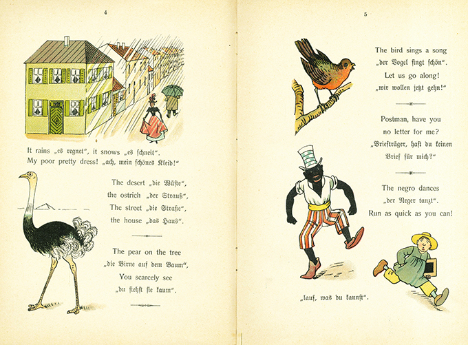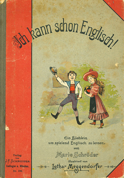 Meggendorfer – Schroeder, Marie, Ich kann schon englisch! Ein Büchlein um spielend englisch zu lernen. Illustriert von L(othar) Meggendorfer Eßlingen u. München, J.F. Schreiber (1914). Titelbl., 32 S. mit sehr vielen farbigen Bildern, farb. illustr. OPp. (etw. berieben u. bestoßen, stärker stockfl.) Papier minim. nachgedunkelt u. mit wenigen zarten Flecken, sonst innen gut erhalten. EA. Krahé 59. Klotz 6568/1. Slg. Hobrecker 6978.