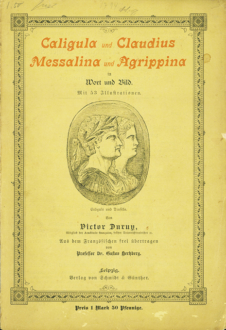 Antike – Römische Kaiserzeit – Duruy, Victor, Caligula und Claudius / Messalina und Agrippina in Wort und Bild. Übertr. von Gustav Hertzberg. (= Reihe „Geschichte der Römischen Kaiserzeit“) Leipzig, Schmidt & Günther 1894. 4°. 80 S. mit 53 Illustrationien in Holzschnitt, illustr. OBrosch. (diese mit stärkeren Gbrsp., Gelenke eingerissen). Der unbeschnittene Schnitt u. vereinzelt das Papier etw. stockfl. Insgesamt, in Anbetracht der Fragilität, gut erhalten. DEA.