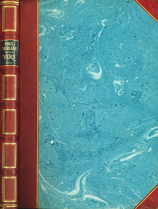 Verlaine, Paul, Vers. München, Kurt Wolff 1923. Gr.-8°. Titelbl., 190, (10) S., OHalblederbd. mit Lederecken, Goldpr. u. Kopfgoldschnitt, marmor. Überzugspapier. Einband minim. berieben, insges. sehr schönes Exemplar. Göbel 21. * Verlaines Gedichte in französischer Sprache, sehr schön in Grün u. Schwarz gedruckt.