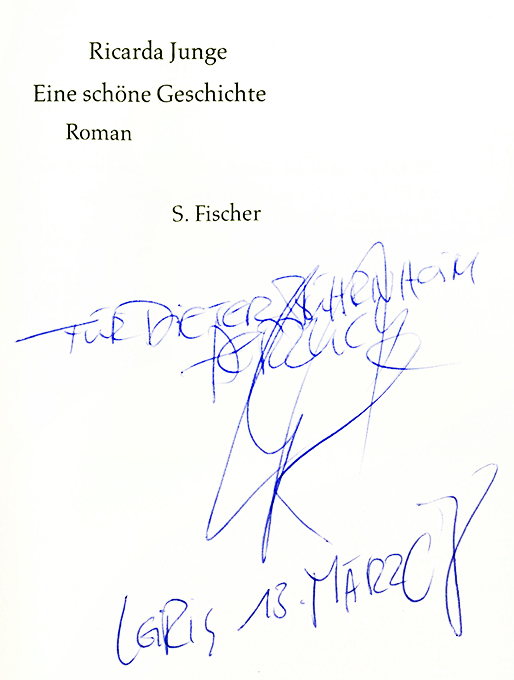 Junge, Ricarda, Eine schöne Geschichte. Roman. Frankfurt, S. Fischer 2008. 255 S., OPp. mit farb. ill. OUmschl. (dieser an den Kanten minim. berieben). Sonst tadellos. EA. * Titelblatt mit eigenhänd. Widmung der Autorin an den Leipziger Antiquar Dieter Bührnheim.