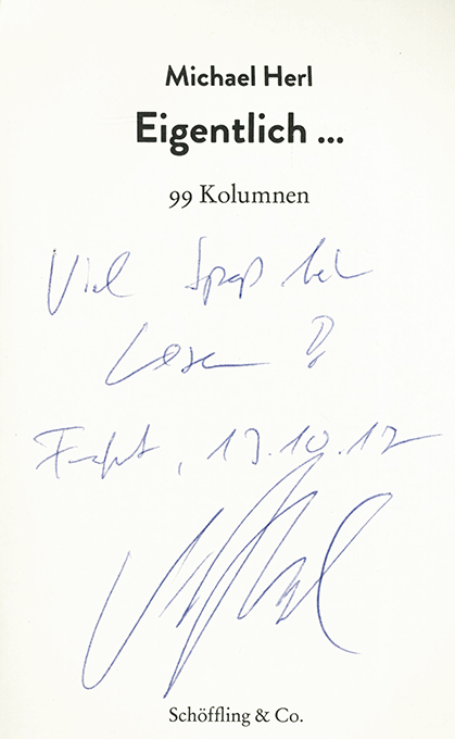 Herl, Michael, Eigentlich… 99 Kolumnen. Frankfurt, Schöffling 2017. 207 S., OPp. mit farb. ill. OUmschl. Gutes Exemplar. EA. * Titelblatt mit eigenhänd. vierzeil. Grußwidmung mit Signatur „Viel Spaß beim Lesen!…“ des Autors. – „Seine Kolumnen, bekannt aus der ‚Frankfurter Rundschau‘, bewegen, sorgen für Wut, Gezeter, Diskussionen, lautes Lachen oder leises Schmunzeln – denn Herl kennt keine Gnade.“ (Umschlag)